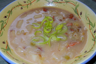 - Fry bacon in last soup pot or dutch oven. Add leek and potatoes, and allow to brown slightly while stirring in salt, pepper, and Mace. Add chicken stock and bring to a rolling simmer to let potatoes cook through. Add milk. To thicken the soup, create a “slurry” with the wine and cornstarch. Pour the mixture into the simmering soup, bring to a boil to allow the starch to thicken to your likeness. You may repeat the slurry with water, milk, or stock (or more wine!) to thicken more. Serve in large bowl, topped with leaks. Warm crusty bread accompanies this beautifully!